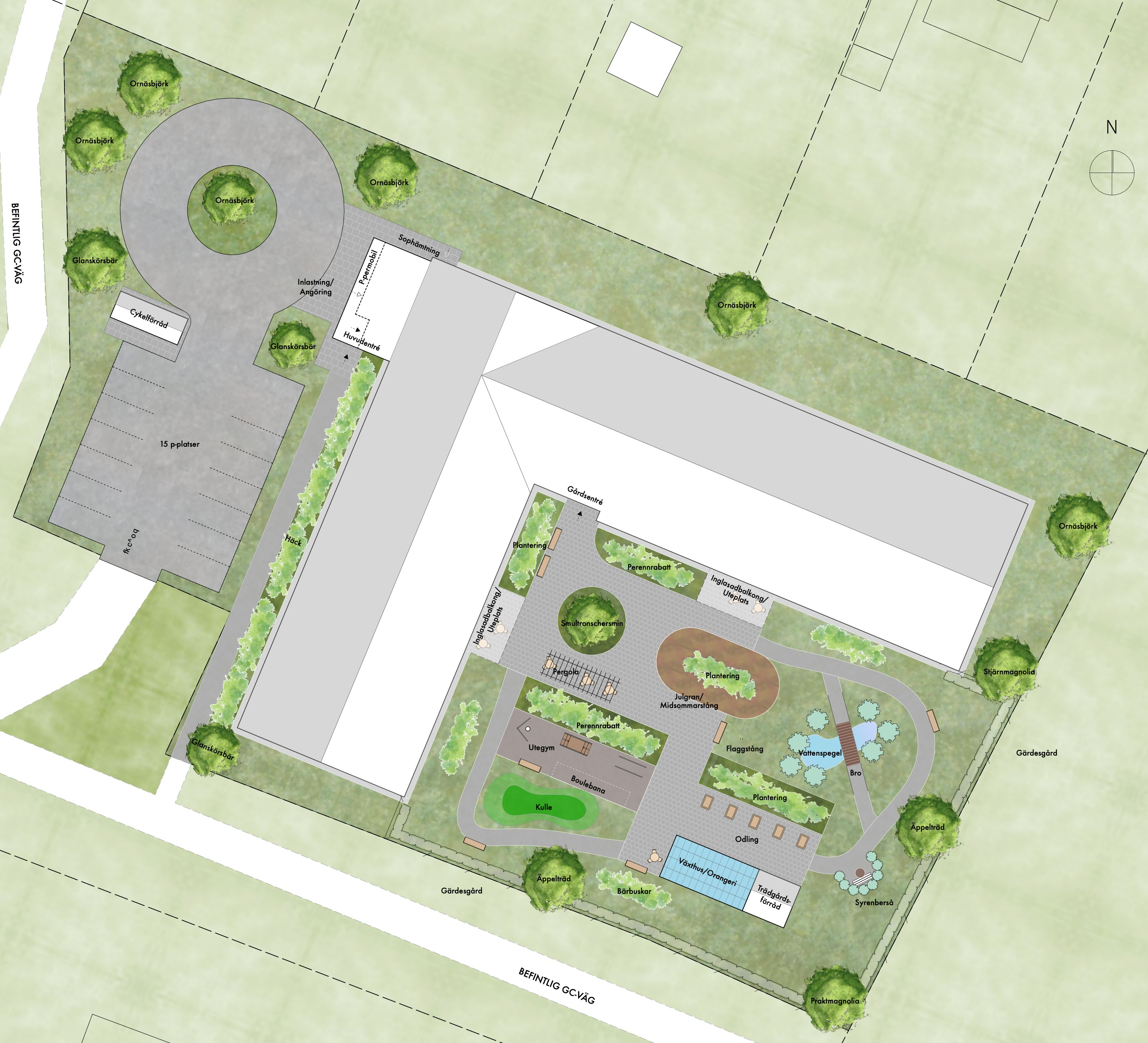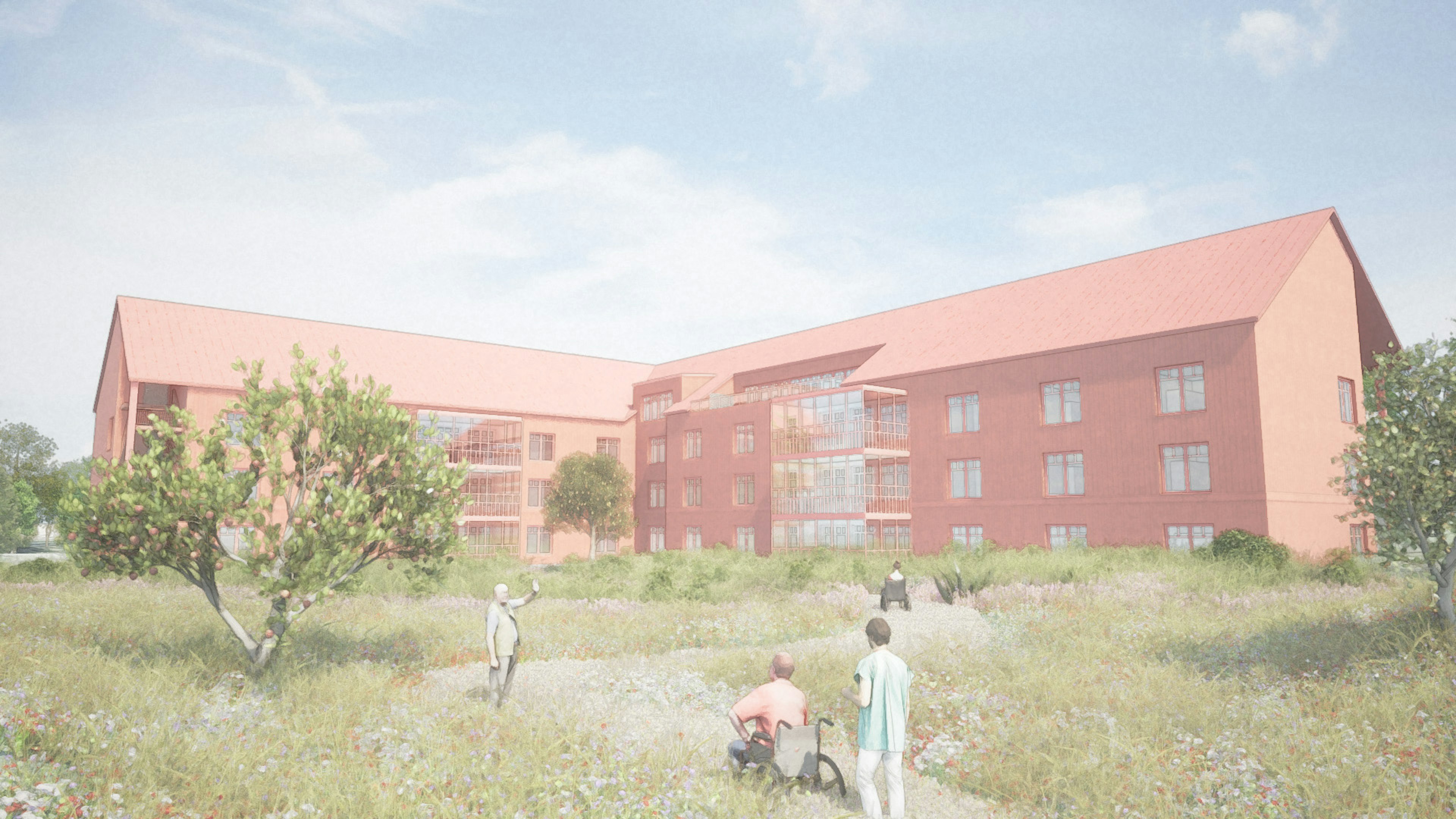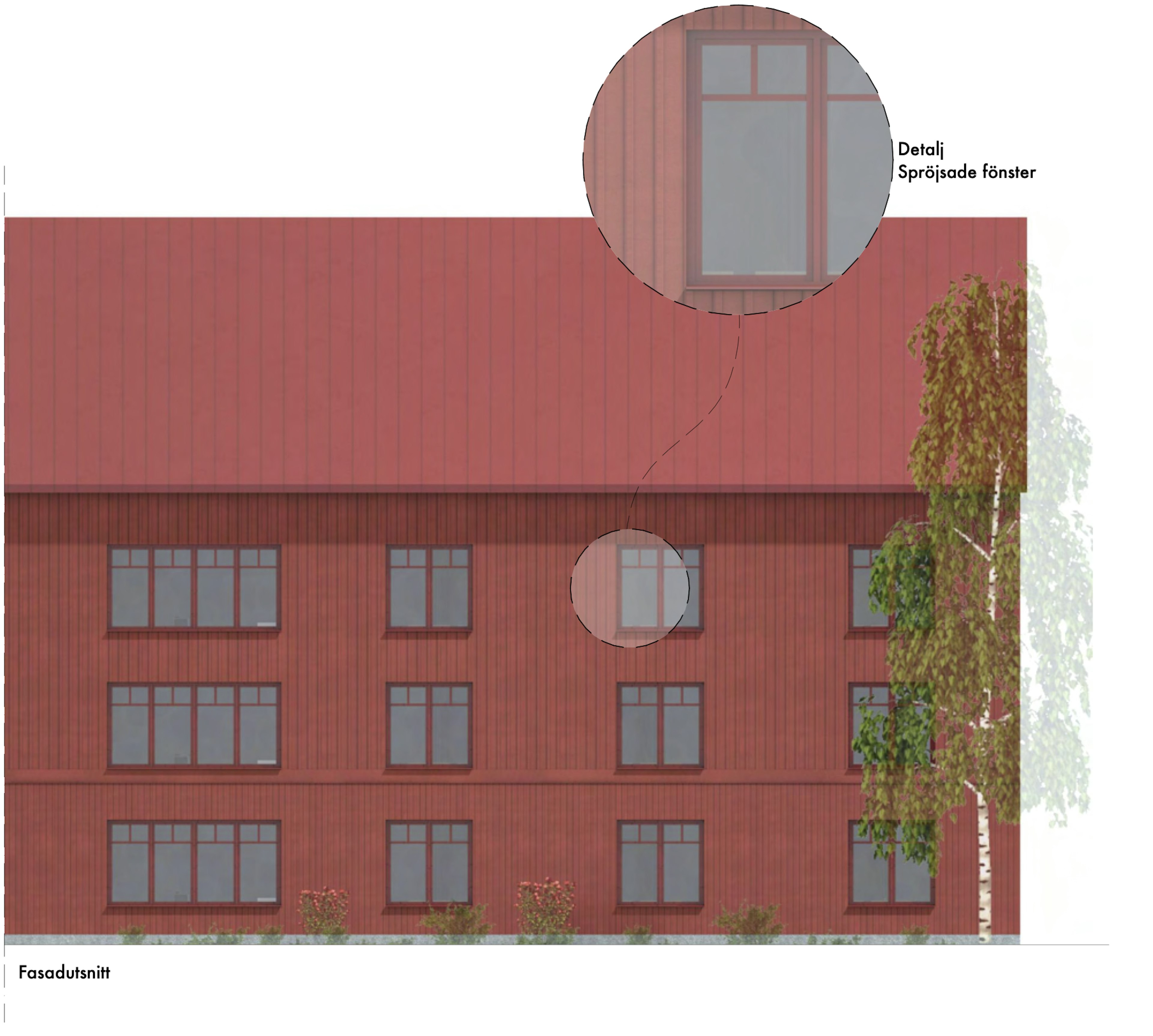 Förslaget hämtar inspiration från den traditionella Hälsingegården, med enkla volymer och material som trä och en proportionerlig husvolym i tre våningar. Det markanta sadeltaket i röd kulör och fasaden av faluröd lockläkt skapar ett monokromt rött hus som i sin enkelhet skapar en tilltalande estetik som känns bekant i sin omgivning och bidrar till en trivsam utemiljö.
