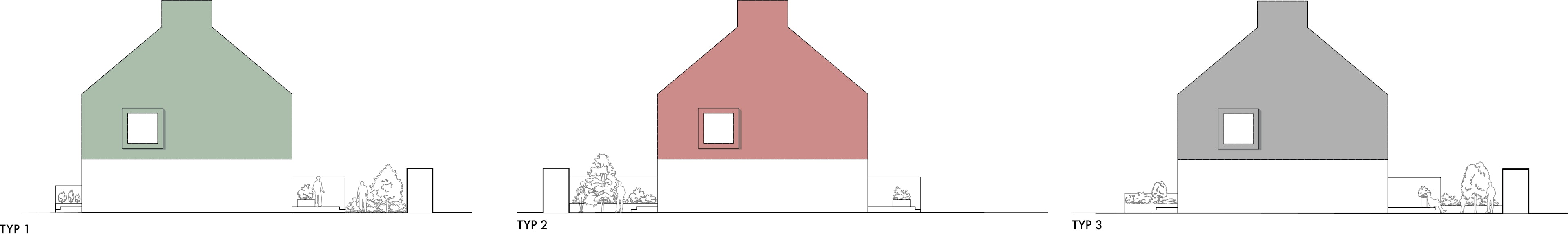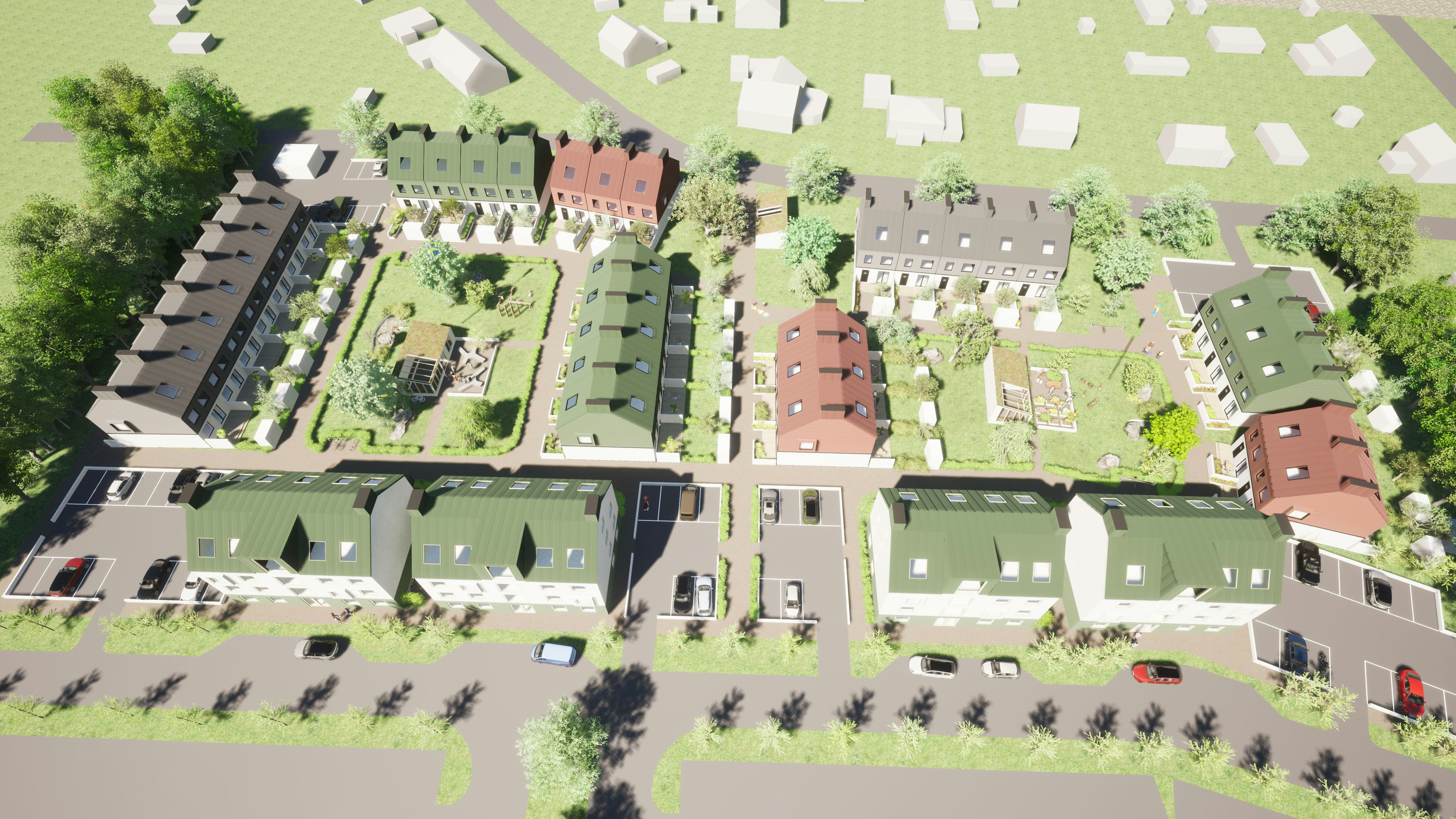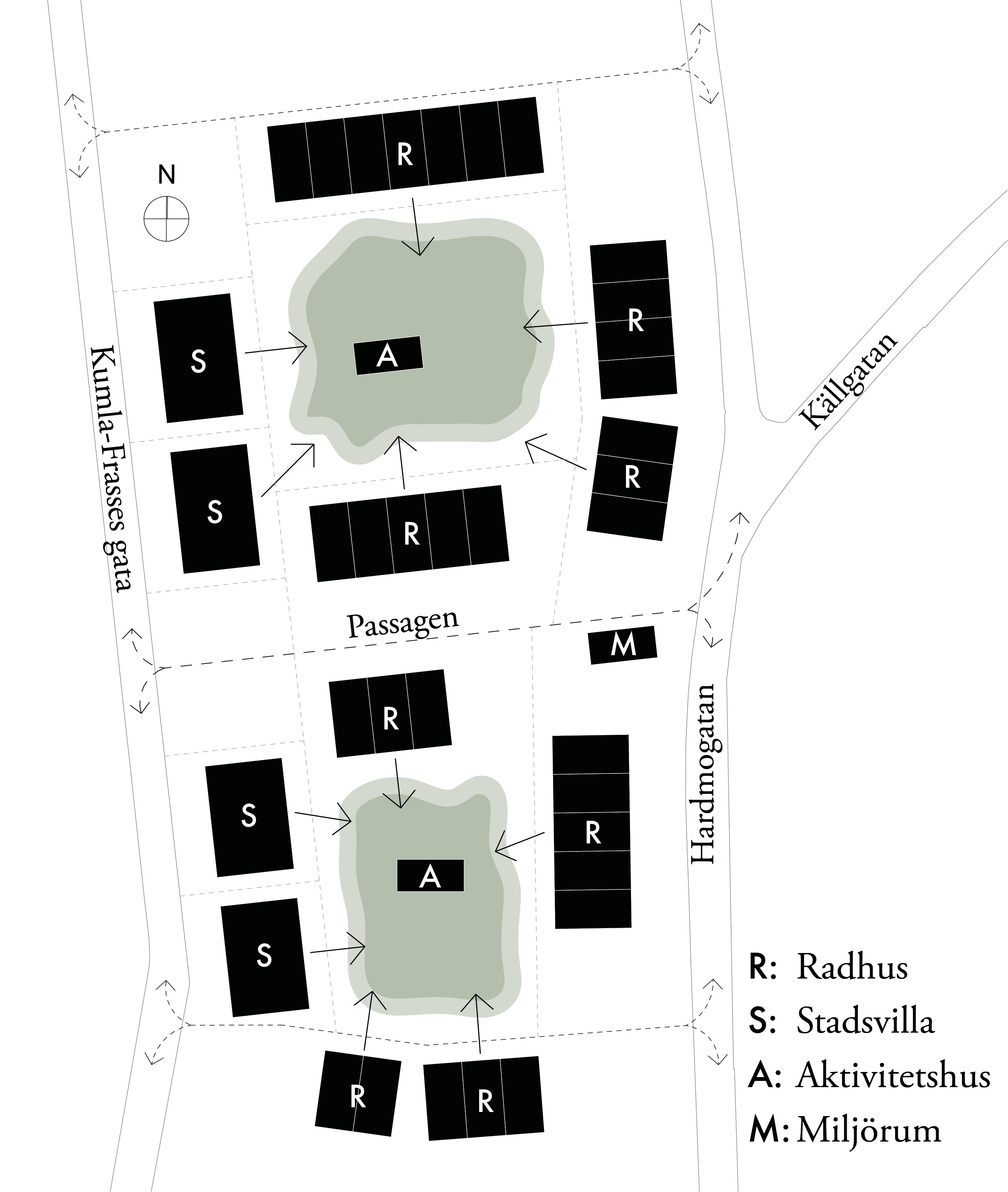 Förslaget bygger på en idé om att tydligt definiera två gemensamma trädgårdar som blir aktiva mötesplatser för de boende. De bägge trädgårdarna förses med lekplats och ett aktivitetshus som kan fungera som verkstad, cykelverkstad, växthus, festlokal eller för hemarbete. Runt aktivitetshusen finns sittmöjligheter och i närheten finns en lekplats för de minsta barnen. Gårdarna blir ett gemensamt rum för de boende att mötas i, ett tryggt rum för lek under årets alla månader och en plats som kan fyllas med planteringar och odling i den mån leken tillåter. På gårdarna kommer det att planteras nya fruktträd, buskage och häckar, anläggas torrdamm för dagvattenhantering, ordnas med belysning och planeras för odling.