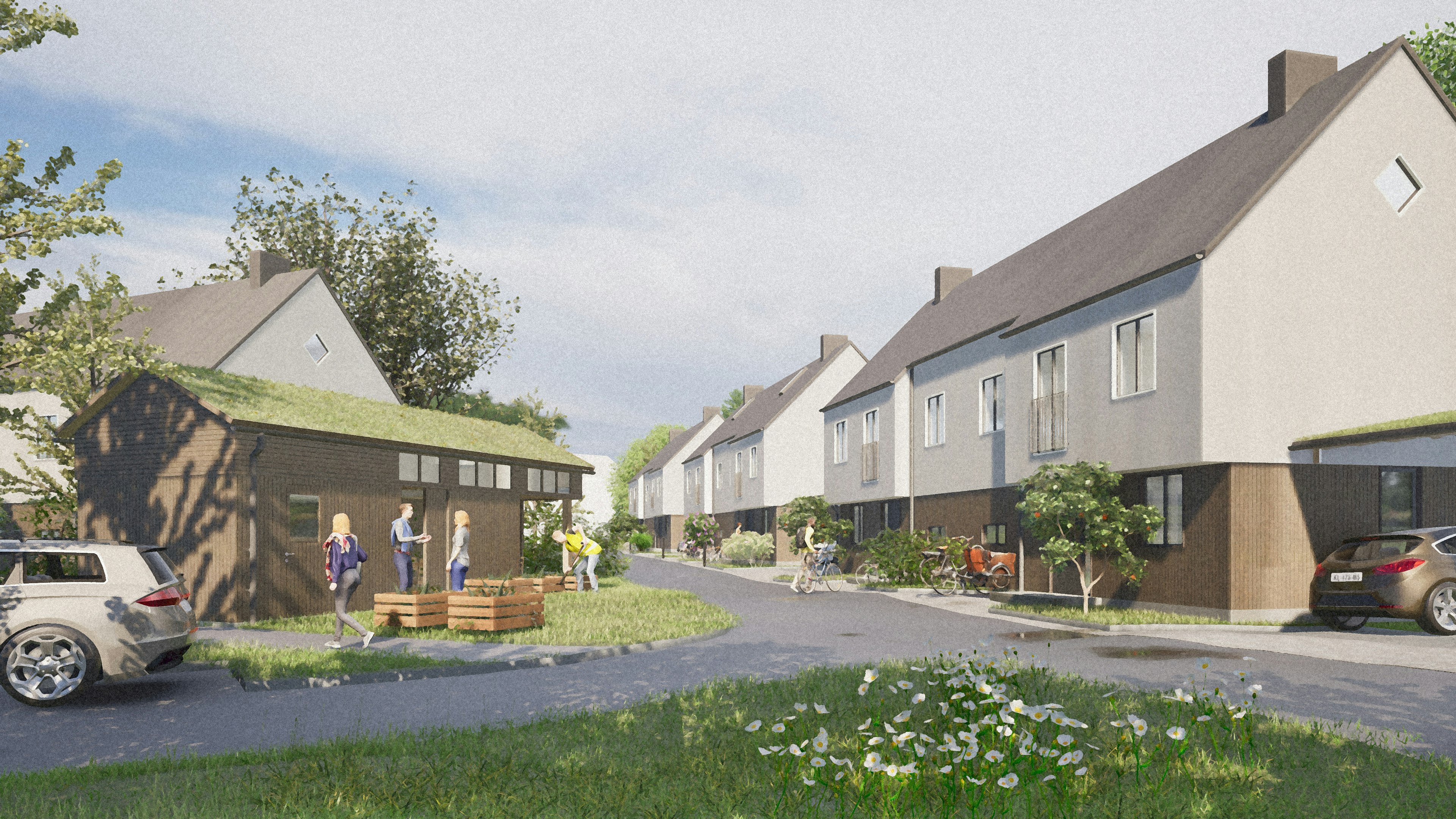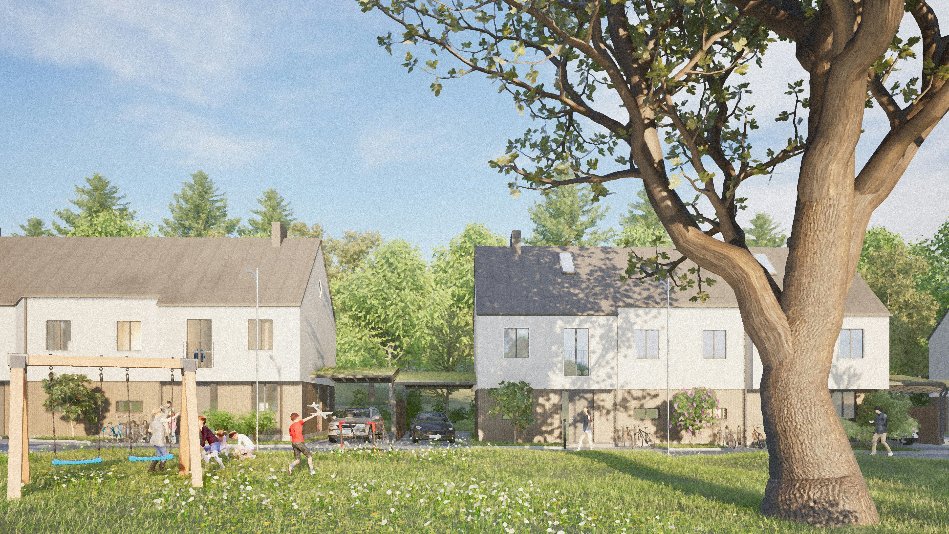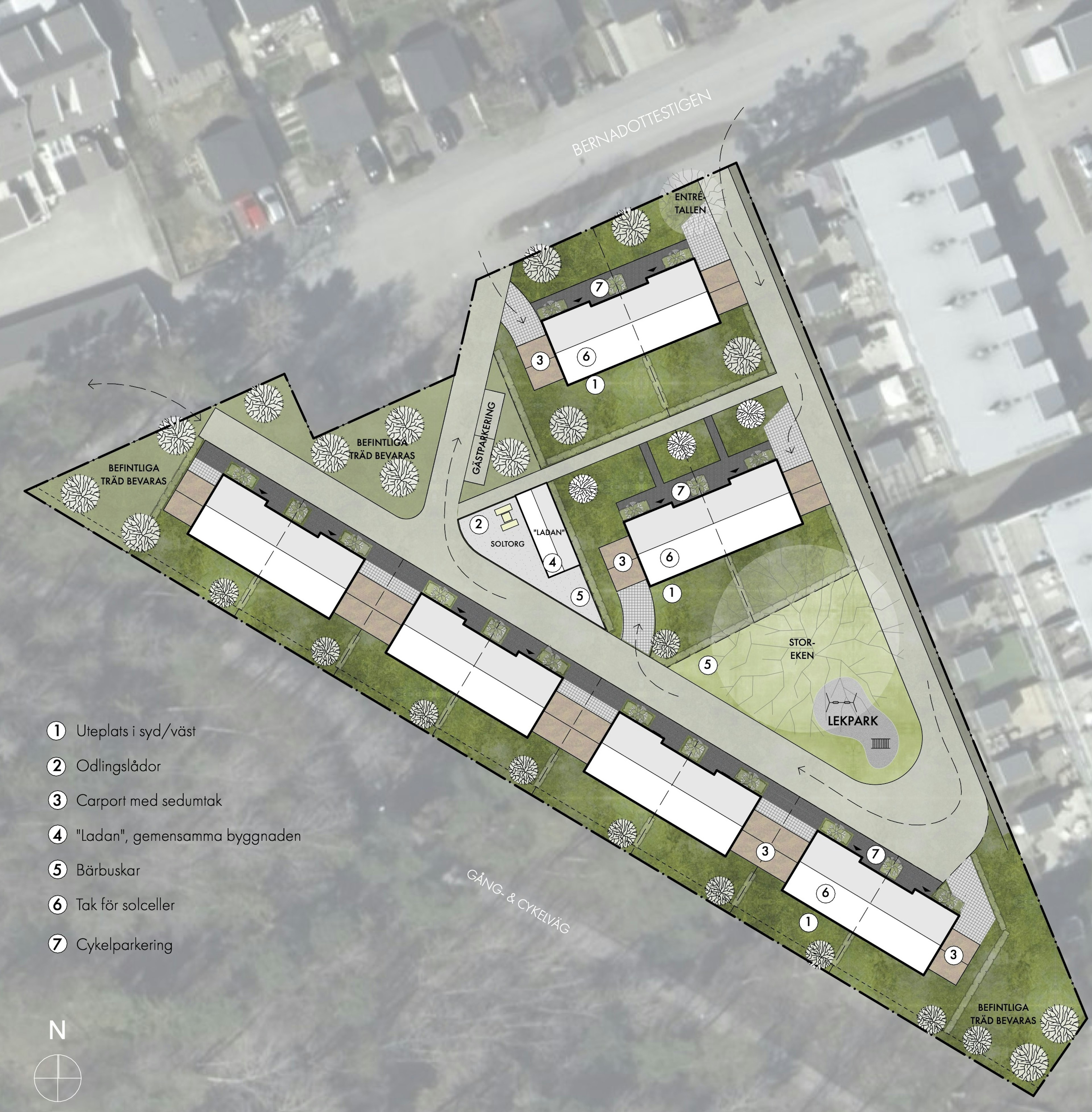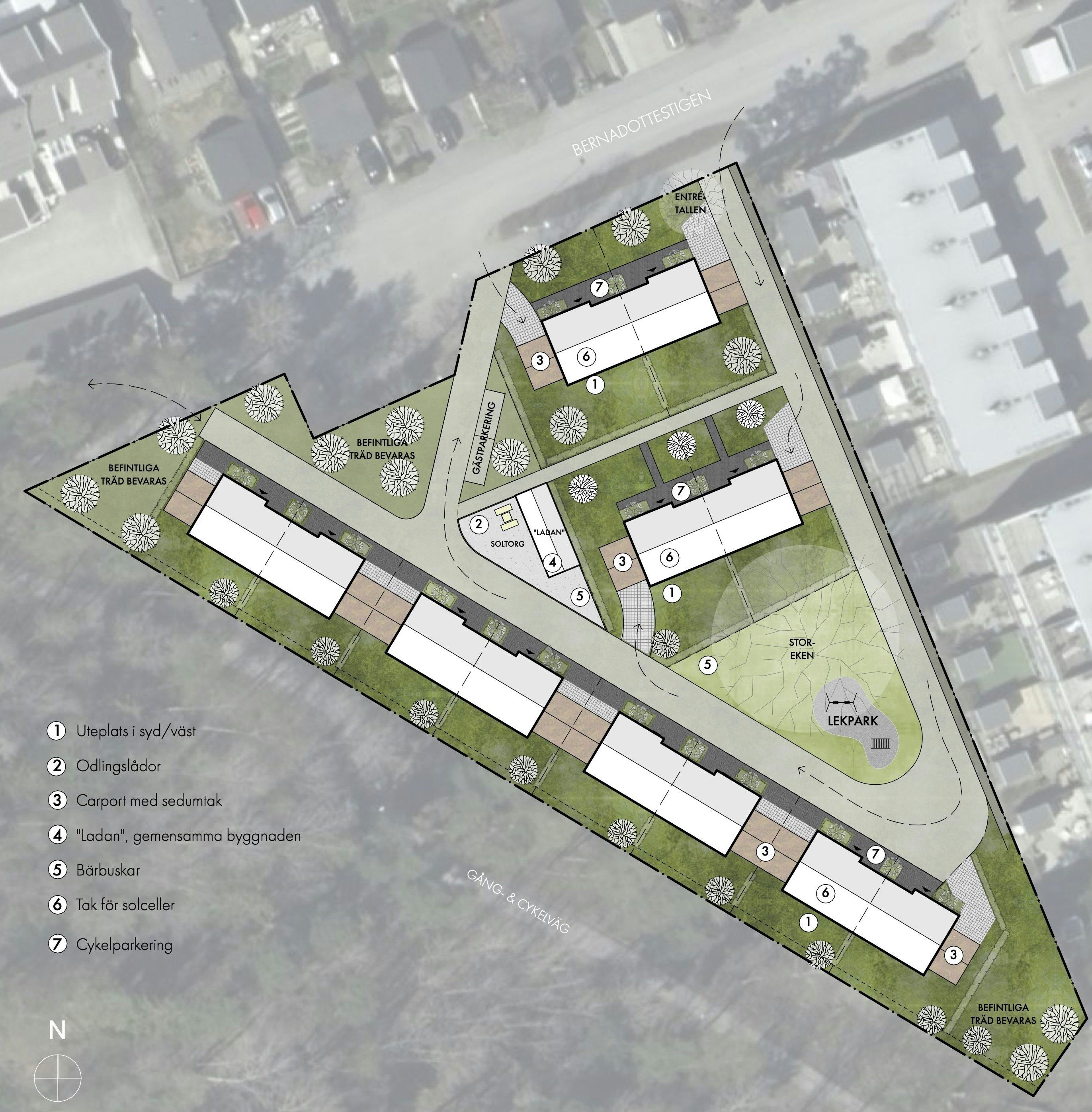I detta tävlingsförslag föreslår vi ett nytt bostadsområde men en egen identitet och unik karaktär. Inspirerade av en engelsk hamlet vill vi skapa en tydlig och trygg boendemiljö som inbjuder till gemenskap men också erbjuder det egna hemmets avskildhet. Centralt för förslaget är en centralt placerad jättelik ek vars lövverk skuggar områdets lekplats. Bilar trollas bort under tak mellan husen för att inte vara det dominerande intrycket av det gemensamma rummet.