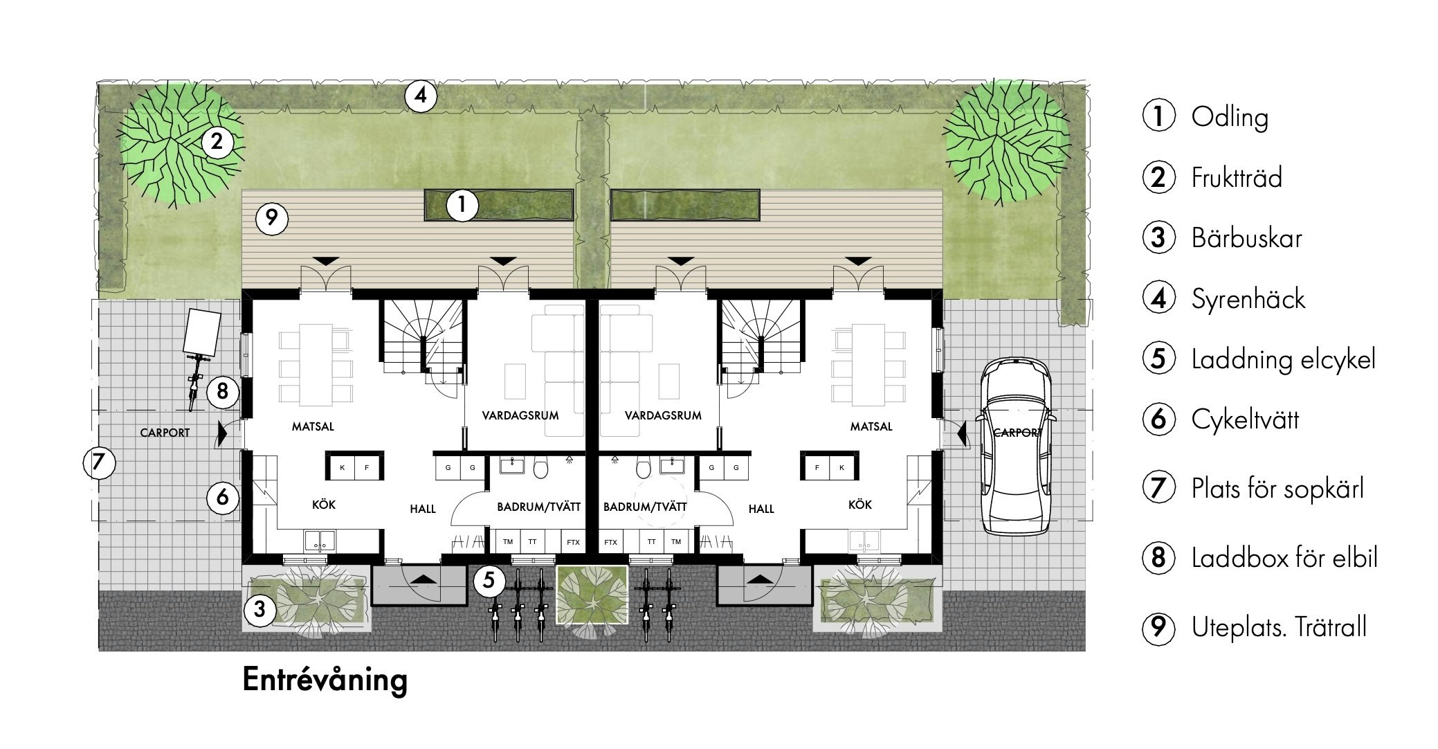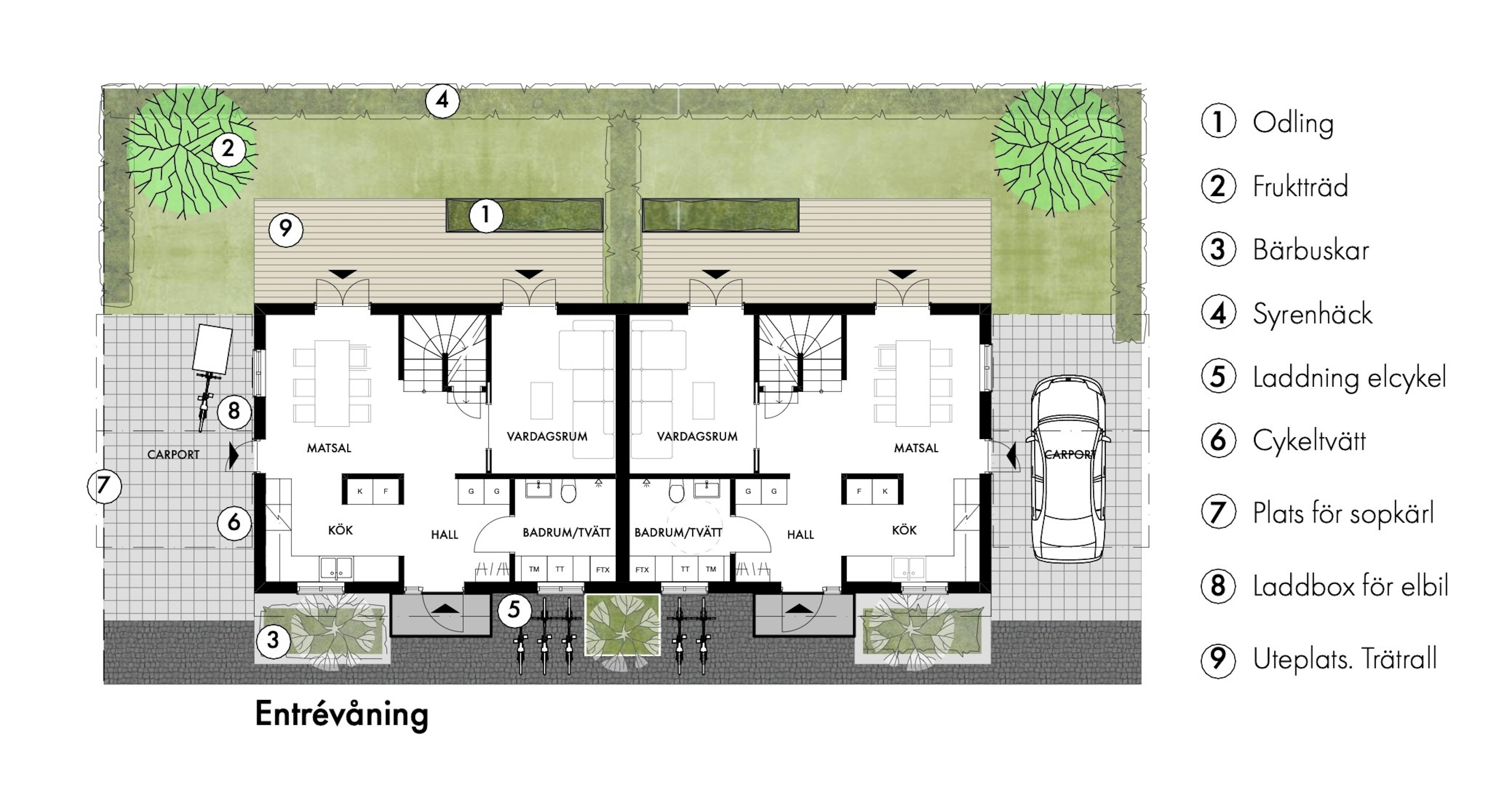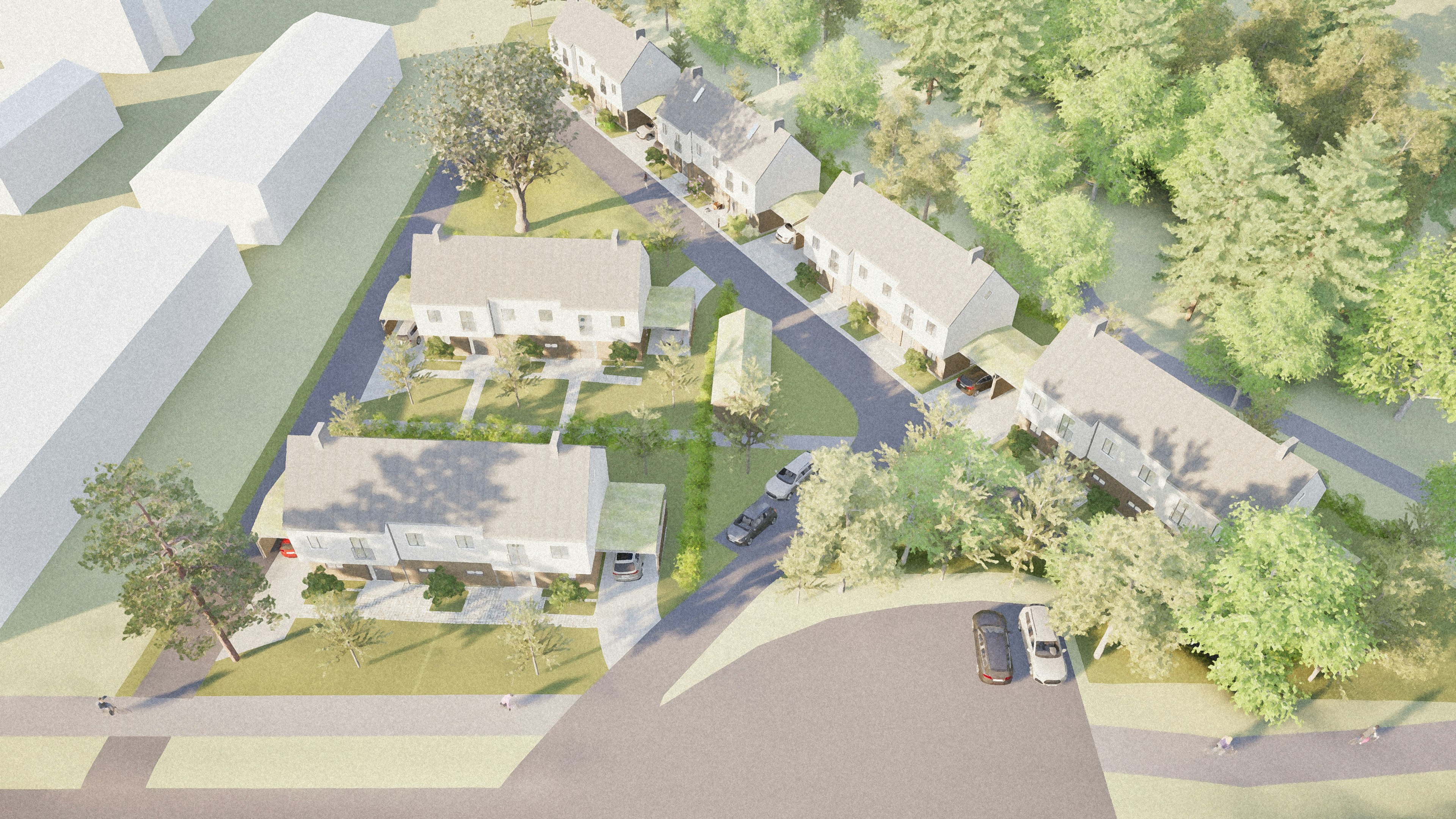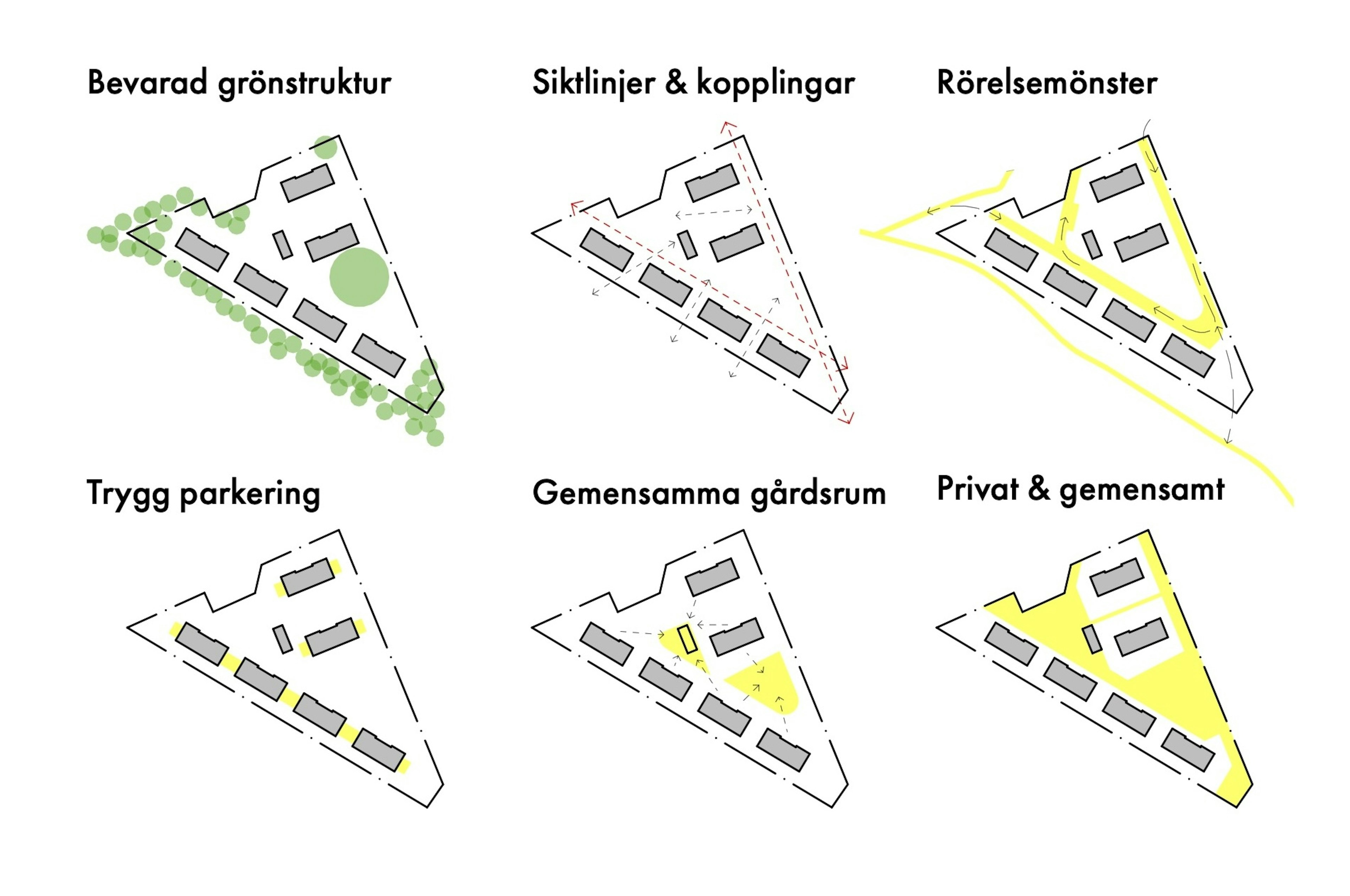 I detta tävlingsförslag föreslår vi ett nytt bostadsområde men en egen identitet och unik karaktär. Inspirerade av en engelsk hamlet vill vi skapa en tydlig och trygg boendemiljö som inbjuder till gemenskap men också erbjuder det egna hemmets avskildhet. Centralt för förslaget är en centralt placerad jättelik ek vars lövverk skuggar områdets lekplats. Bilar trollas bort under tak mellan husen för att inte vara det dominerande intrycket av det gemensamma rummet.