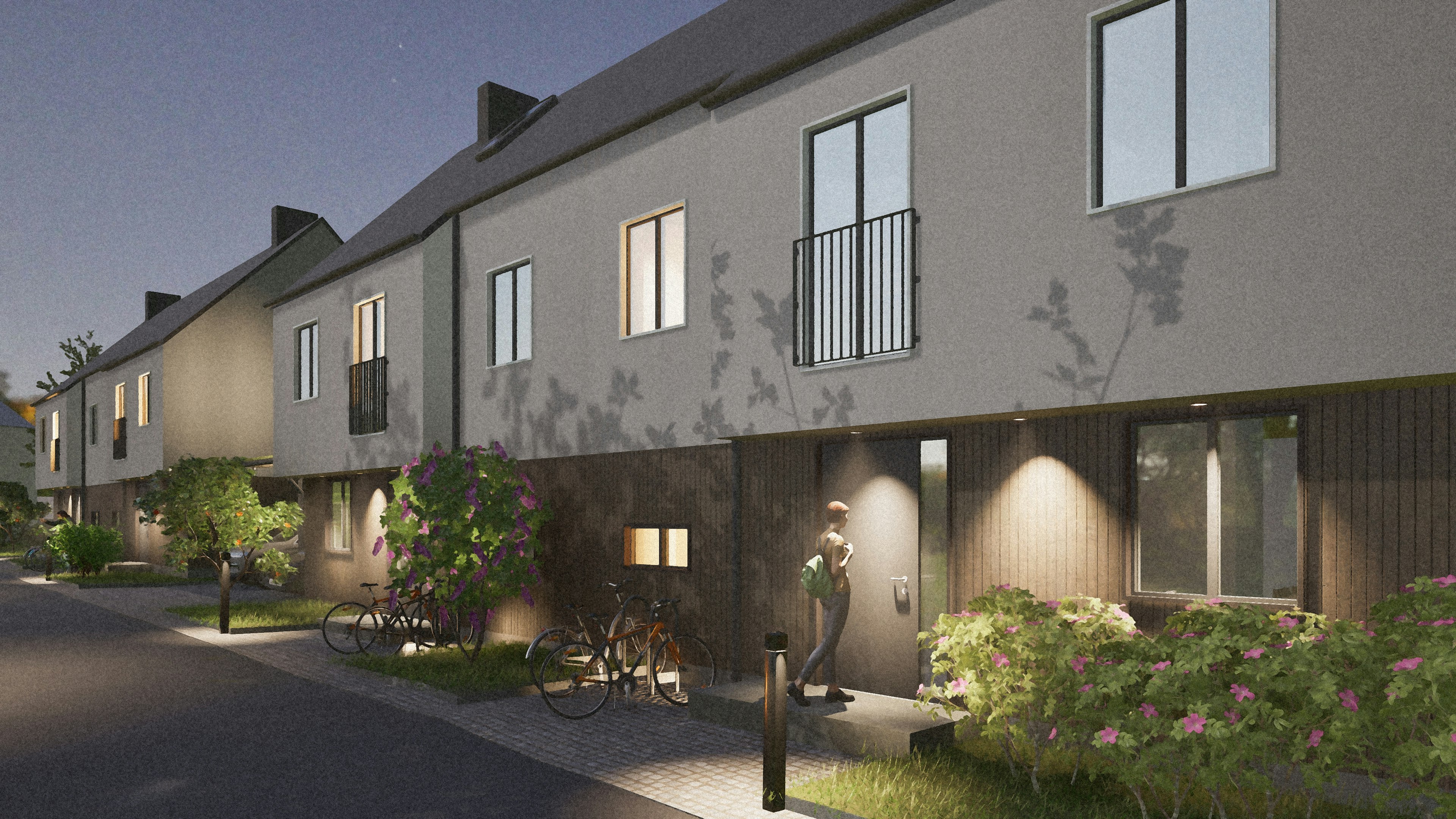 Byggnaderna kommer att utformas med gavelmotiv som ger ett dynamiskt och estetiskt tilltalande uttryck. Kombinationen av träpanel på entrévåningen och den ljusa putsfasaden ger ett tidlöst och sofistikerat uttryck. Den övre våningen kragar ut över entrén och skapar ett integrerat skärmtak som ger både skydd och en elegant övergång mellan våningarna. Taken täcks med bandtäckt plåt i grått vilket vi tycker fungerar väl med husens moderna men samtidigt klassiska uttryck.