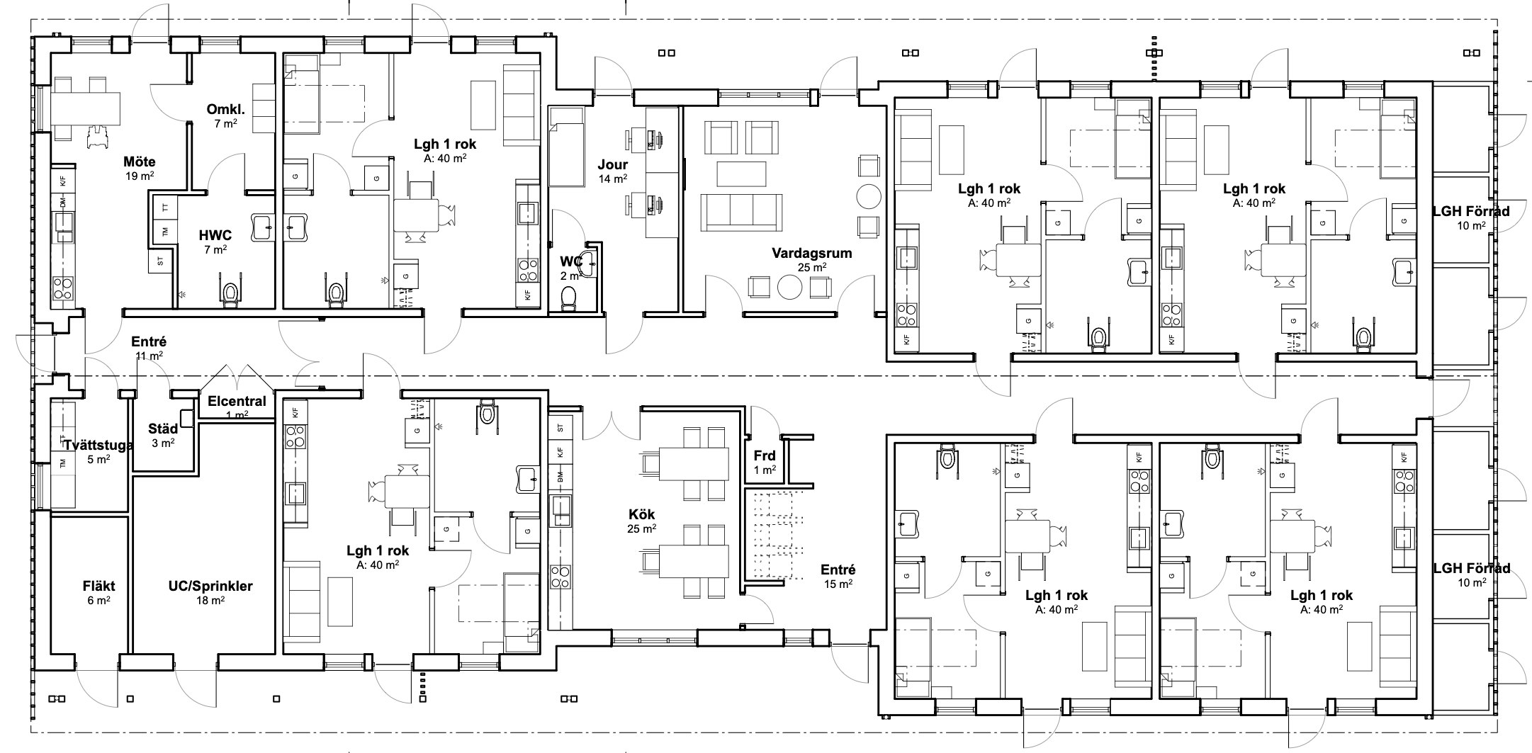 Boendet består av 6 lägenheter i ett plan där alla lägenheter har tillgång till egen uteplats. Fokus har lagts på att öka de boendes självständighet i såväl de privata lägenheterna som i de gemensamma utrymmena.