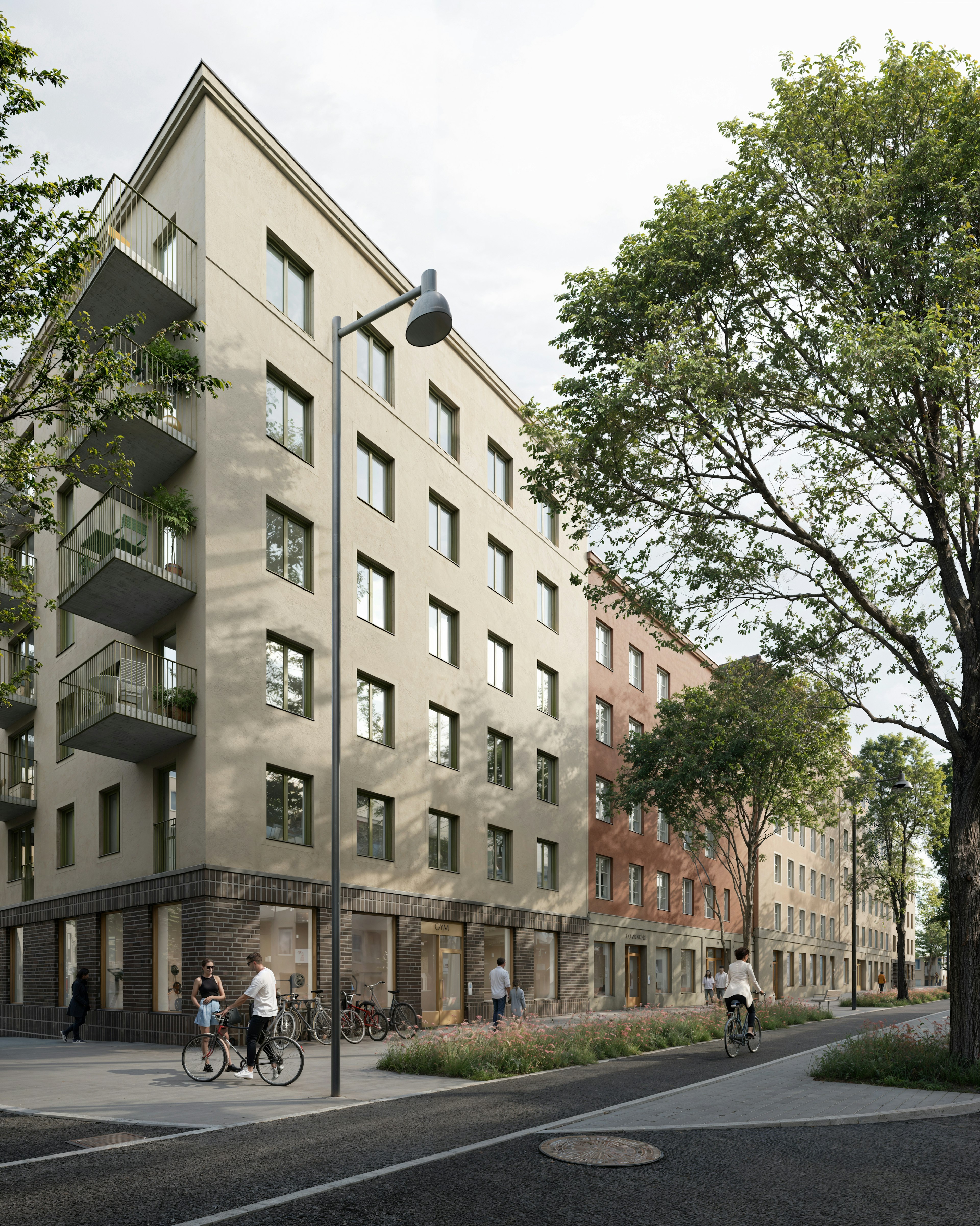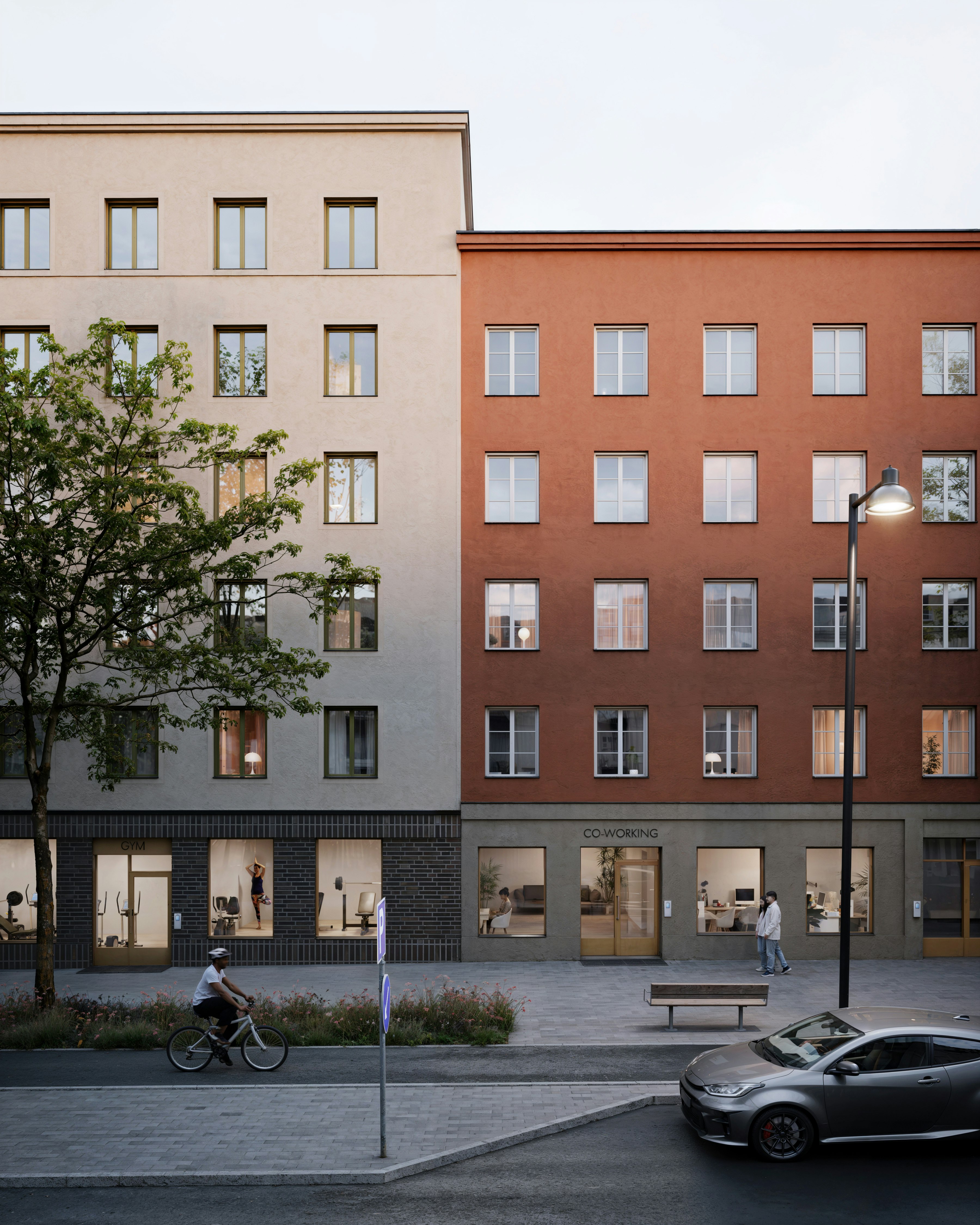 Husets mittvolymer, som vetter mot huvudgatan, har utsmyckats med genomarbetade detaljer som förstärker byggnadens klassiska uttryck – spröjsade fönster, eleganta takfotsgesimser och markerade fönsteromfattningar bidrar till en känsla av kvalitet och omsorg. De två östra huskropparna, som gränsar mot befintlig 60-talsbebyggelse, har fått en något mer nedtonad och tidlös gestaltning med bland annat gedigna tegelsocklar. Detta skapar en mjuk övergång till den omgivande miljön.