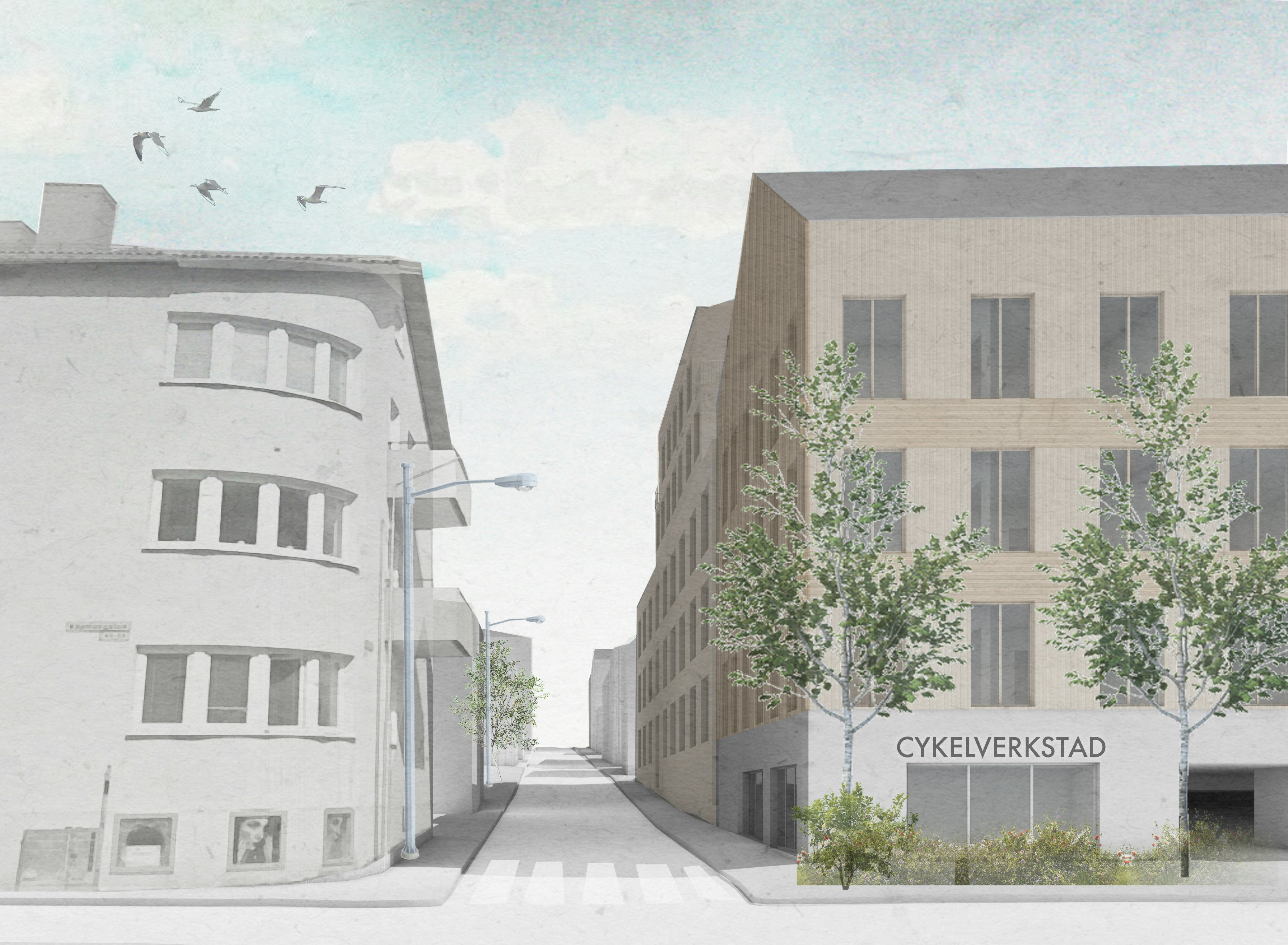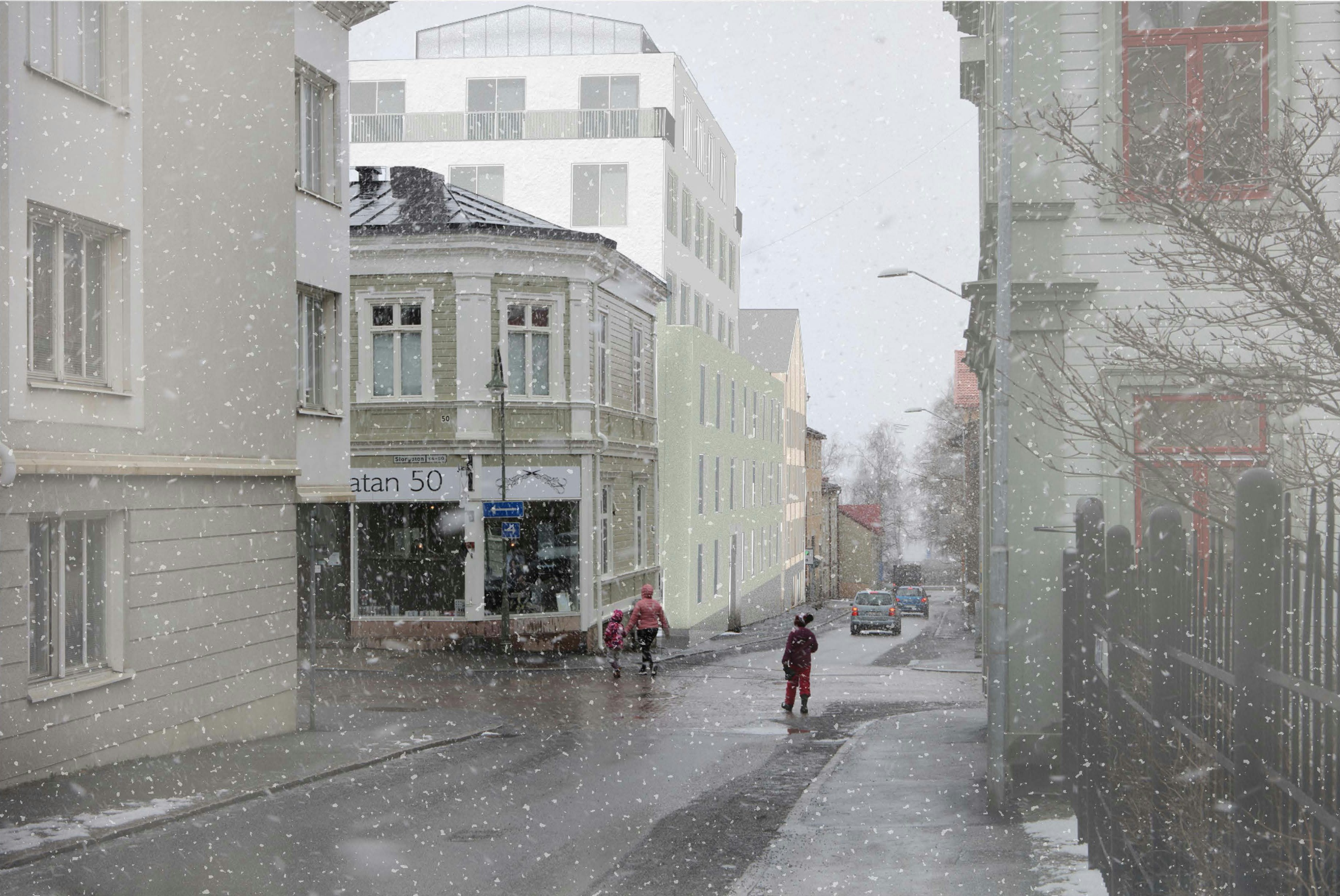 Mitt i centrala Östersund växer ett ny kvarter fram som blir en förtätning av staden och ställer krav på ett medvetet förhållningssätt till den omgivande bebyggelsen. Den föreslagna bostadsbebyggelsen på det som idag är en öppen markparkering kan bidra till att förtydliga stadens gaturum och historiska struktur och ger både nya bostäder och arbetsplatser. En förtätning av centrum kan bidra till att skapa en levande stadsmiljö. Parkeringen integreras i förslaget i den nya bebyggelsen, vilket gör att funktionen kvarstår utan att den tillåts prägla stadsbilden på samma sätt som idag För att aktivera bottenvåningarna förläggs entréer mot gatan och i hörnet Köpmangatan/Thomeegränd planeras för en lokal med cykelverkstad och cykelförråd, öppen mot gatan genom stora fönster.