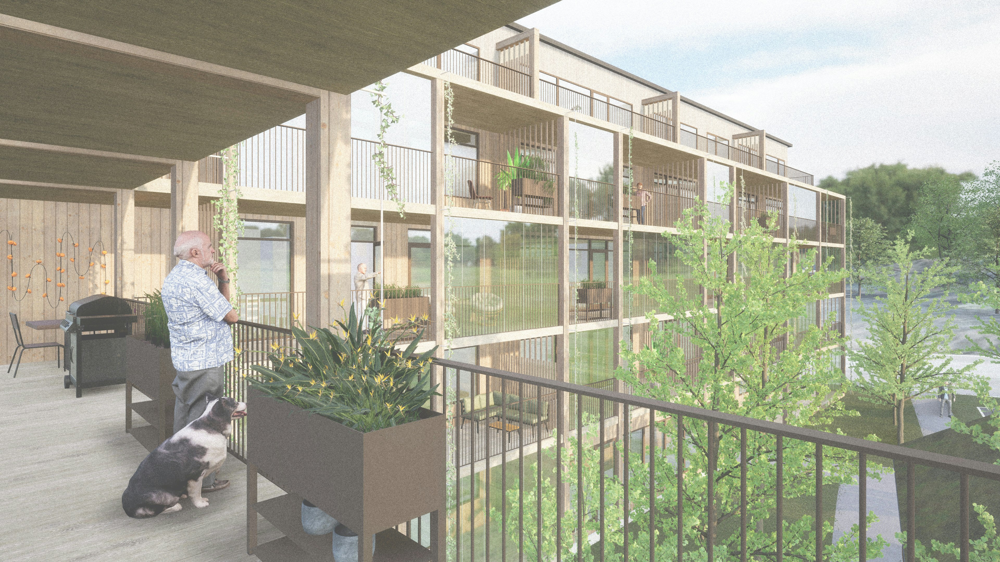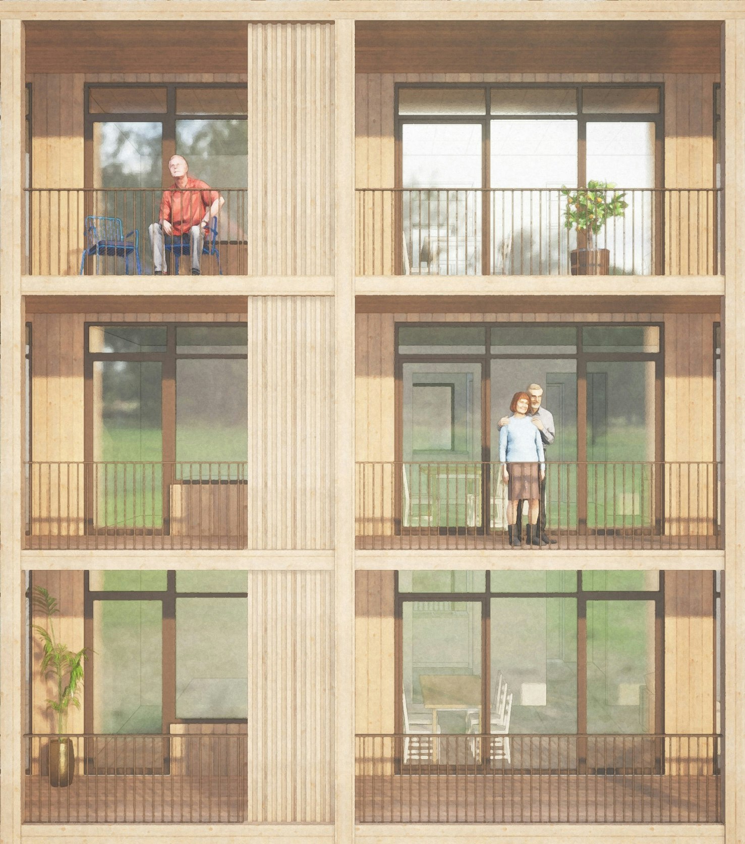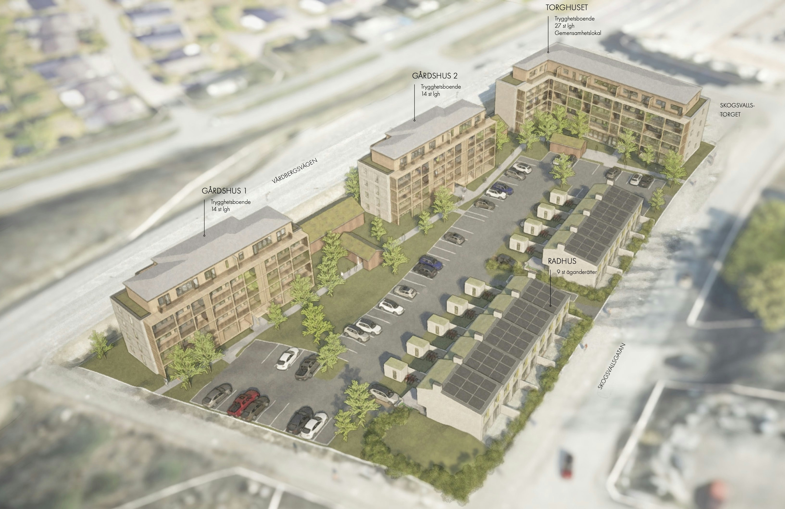 Linköping är en stad med växande behov av bostäder för äldre, och Hjulsbro står ut som den perfekta platsen för ett nytt, attraktivt trygghetsboende i en lugn naturnära miljö. Vår vision är att skapa en unik och attraktiv bostadsmiljö för seniorer. Vi vill bygga vidare på områdets idéer om den moderna trädgårdsstaden och erbjuda ett boende med vertikala trädgårdar som agerar både förgårdsmark och uteplats. Husen har växlande karaktär med tegelfasader mot det publika och varma inbjudande balkonger mot den gemensamma gården. Målet är att skapa ett område som är inkluderande, främjar möten och motverkar ensamhet.